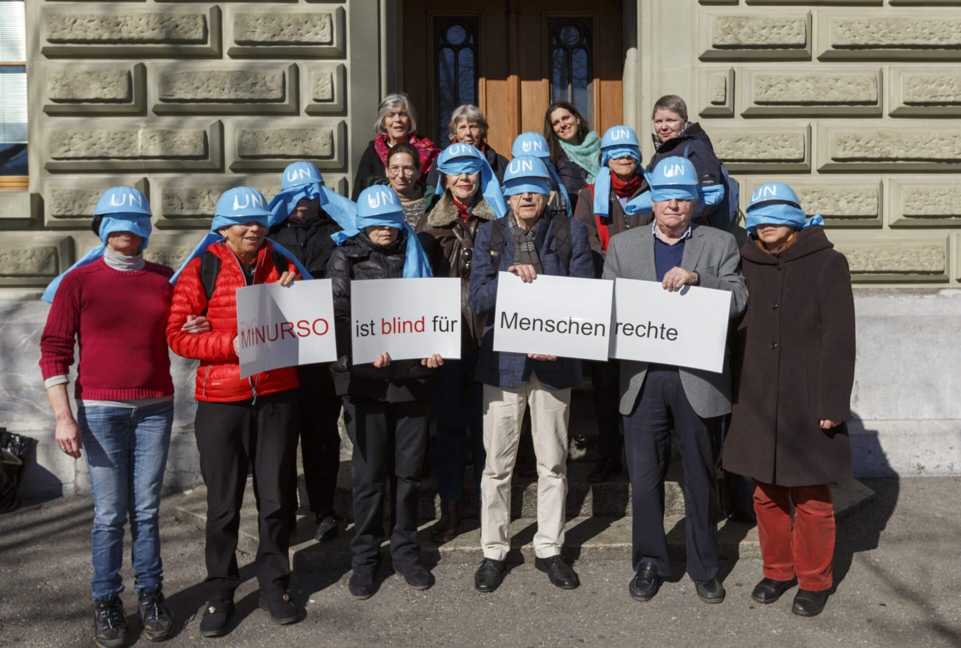 “Blue helmets” delivered weighty mail to the Swiss Federal Council and Parliament this afternoon. In a petition on behalf of 45 organizations and individuals, they demand that Switzerland lobby the UN Security Council to expand the UN mission in Western Sahara to include human rights monitoring.